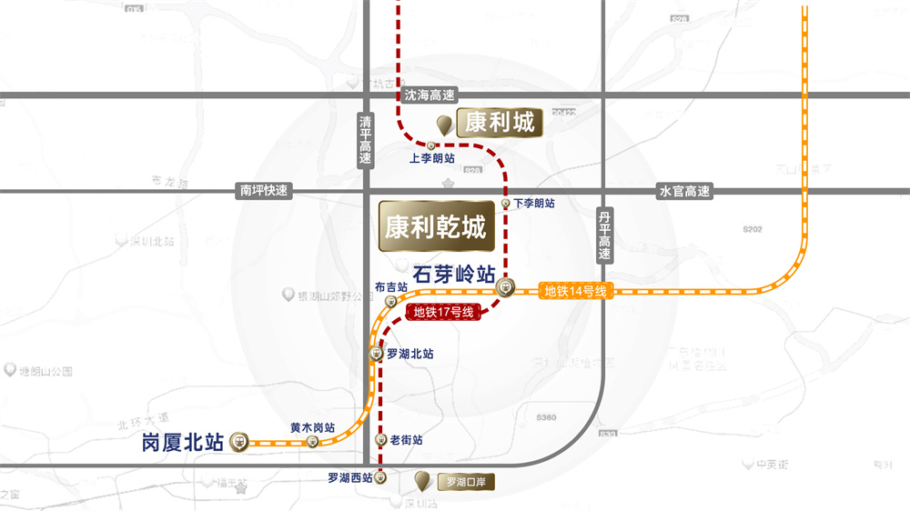 距双地铁(14&17号线)交汇站——石芽岭站仅百余米,14号线2站罗湖,3站福田,17号线直达罗湖口岸;